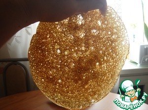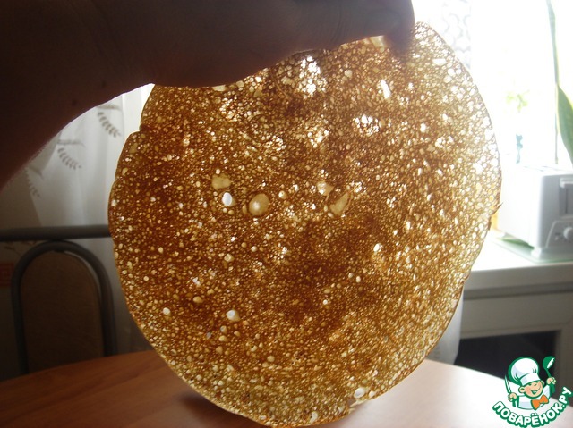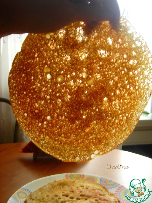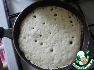 Выпекаем блины. Разогреваем сковороду и подмазываем. Наливаем поварёшкой тесто и распределяем его как можно тоньше по сковороде. Жарим блин с одной стороны. Вот такой красивый и дырчатый.