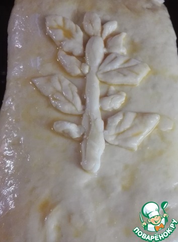 Делим на две части тесто. Раскатываем одну часть, где нужно подрезаем выравниваем края и кладем в середине начинку.