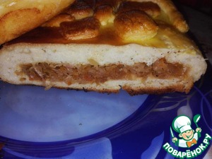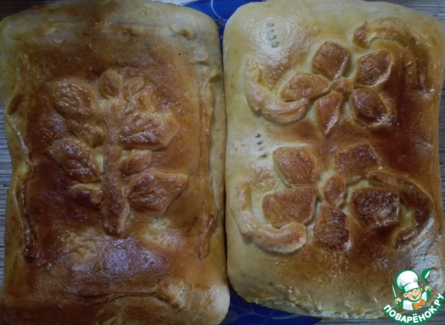 Сворачиваем, соединяем края прищипывая. Переворачиваем швом вниз. Прокалываем обязательно в нескольких местах, чтоб было куда выходить пару, а то разорвет нашу кулебяку.