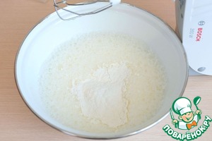 Добавить молоко (1 стакан), растопленное сливочное масло (30 гр), добавить 4 ст. ложки растительного масла, добавить муку (90 гр).