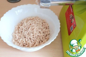 Филе грудки индейки отварить в подсоленной воде до готовности. Затем прокрутить на мясорубке через крупную решетку.