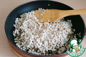 Выложить прокрученное на мясорубке филе грудки индейки. Вернуть сковороду на огонь, смесь хорошо прогреть. Добавить по вкусу соль и черный молотый перец, добавить 4 ст. ложки бульона, в котором варили филе индейки. Фарш хорошо вымешать.