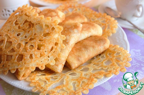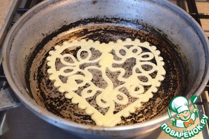 Сковороду раскалить, затем убрать с огня или выключить газ (если у вас газовая плита), нанести по желанию рисунок, затем вновь вернуть сковороду на огонь, выпекать блинчики-салфетки на среднем огне. Вот такой рисунок вы можете нарисовать жидким тестом или сделать рисунок по своему вкусу.