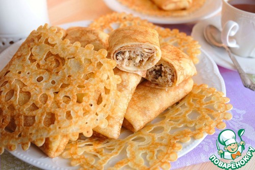 Фаршированные мясом индейки и грибами блины "Праздничные". Они понравятся вашим родным и близким. Блюдо будет смотреться красиво и празднично, если вы приготовите и подадите его на стол в ажурных блинных салфетках.