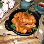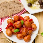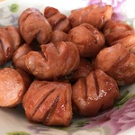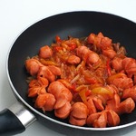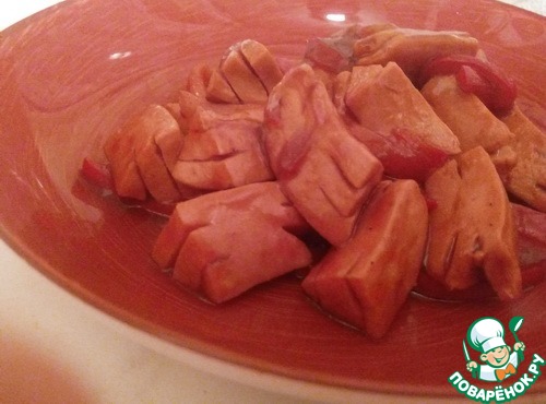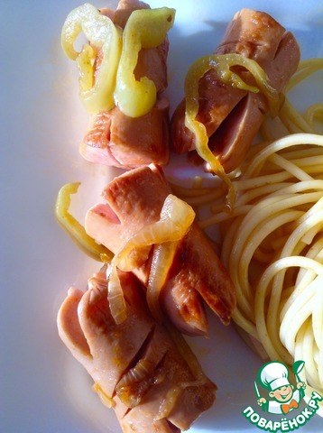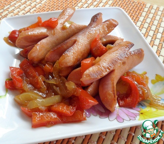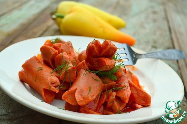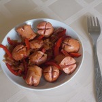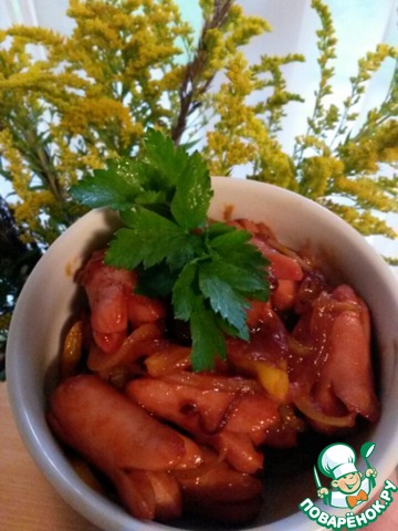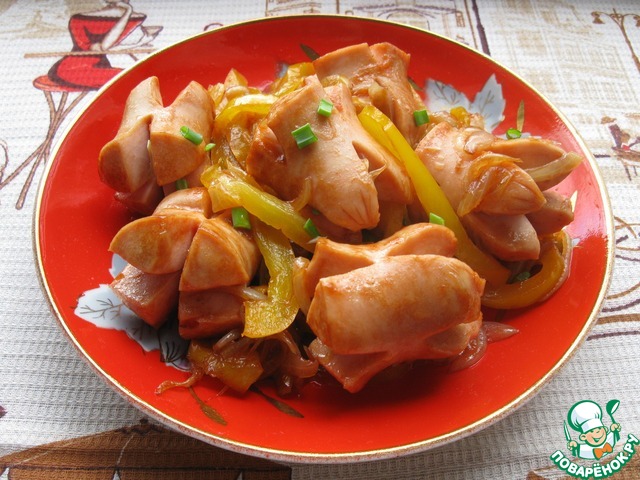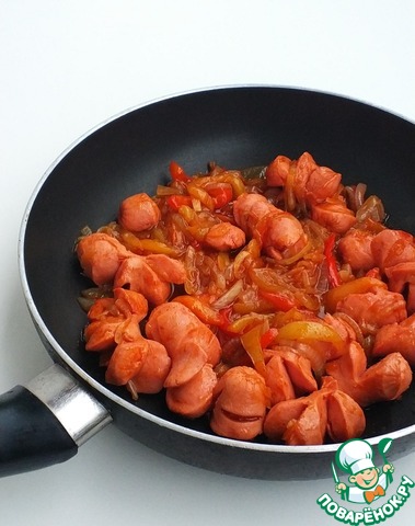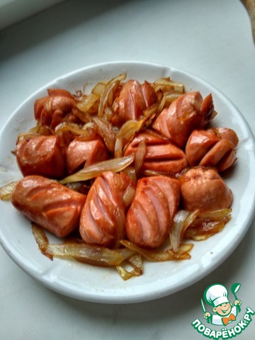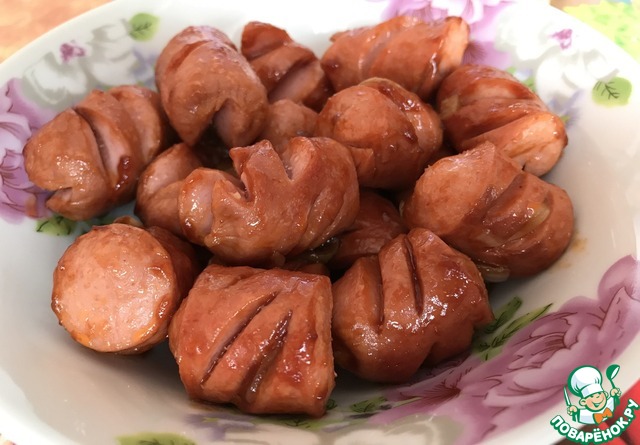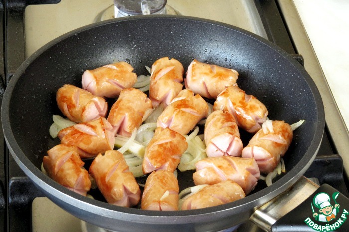 В оригинале сосиски берутся малепусенькие. Я взяла обычные, разрезала их и для пущей красоты сделала на них надрезы, произвольно. Затем обжарила их на растительном масле, на огне чуть больше среднего до приятной золотистости 3-5 минут.