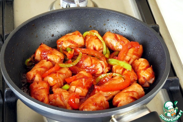 Затем добавляем болгарский перец и так же жарим 3-4 минуты.