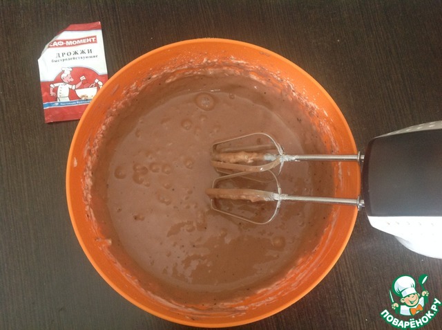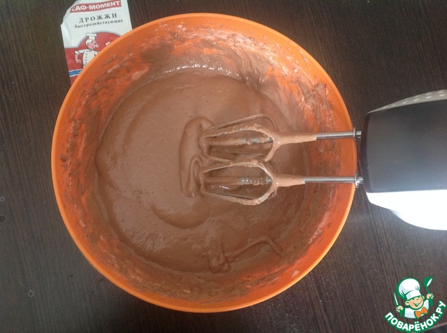 К яйцам добавить муку, простоквашу, дрожжи, Нутеллу. Хорошо взбить.