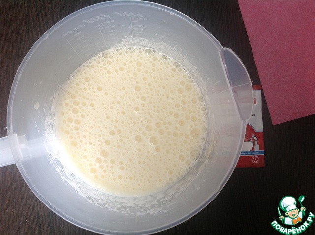 Влить 20 мл растительного масла и ещё раз хорошо взбить. Накрыть крышкой или затянуть пищевой плёнкой и убрать в теплое место для подъёма на 50-60 минут.
