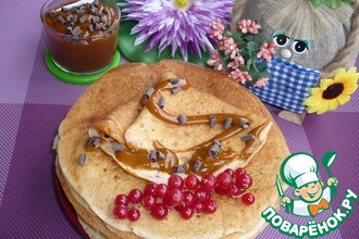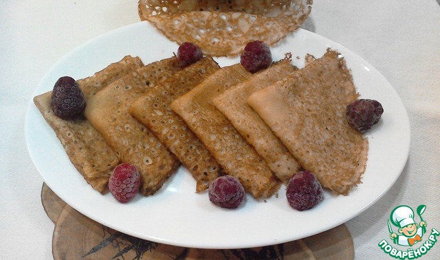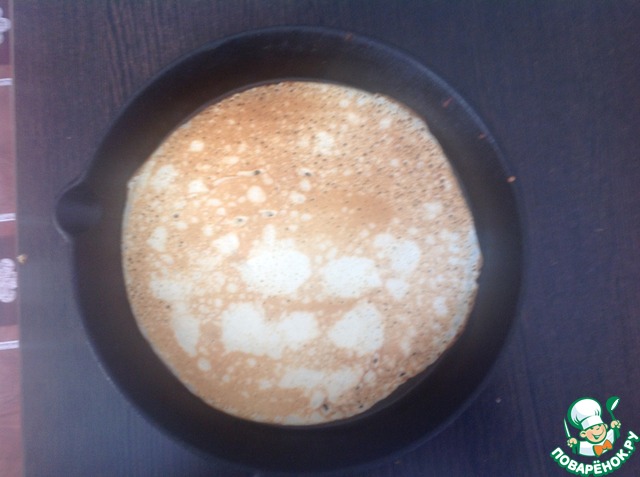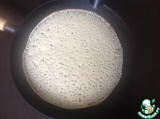 Выпекать блины на разогретой сковороде, чуть смазывая сковороду растительным маслом с помощью кулинарной кисти. Как только появятся пузырьки на поверхности блина, перевернуть на другую сторону. Я жарю на чугунной тяжелой сковороде на тихом огне. Блины переворачиваются без проблем.