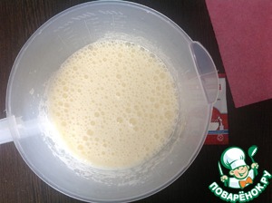 В большой миске соединить яйца, сахар и соль. Хорошо взбить до пышного состояния.