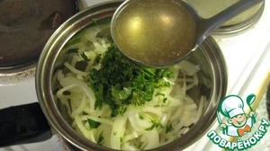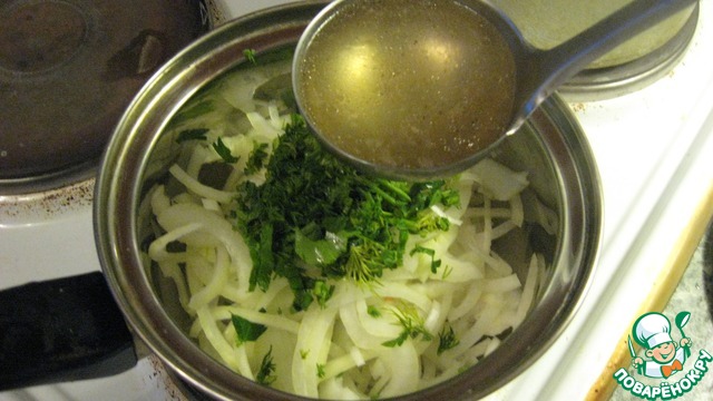В сотейник выкладываем лук, зелень и заливаем бульоном в котором варилось наше мясо и томим минуты 2-3