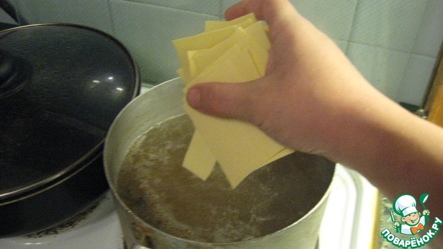Пока томится лук варим лапшу для Бесбармака в бульоне из под мяса минуты 4-6