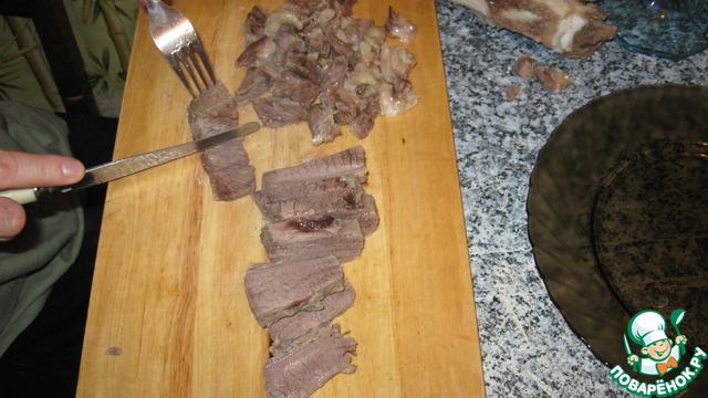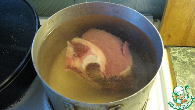 Мясо залить ХОЛОДНОЙ водой и поставить вариться. После закипания снимите пенку, убавьте огонь и варите мясо до готовности, у меня примерно 2 часа варилось.