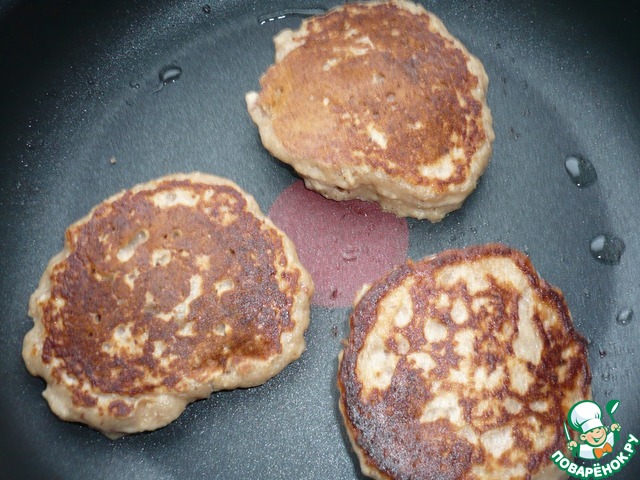 На слегка смазанную подсолнечным маслом горячую сковороду столовой ложкой выкладывать оладьи. Огонь уменьшить и печь с обеих сторон до готовности.