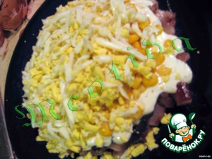 Выкладываем слой кукурузы, затем тертые на крупной терке яйца и снова покрываем оставшимся соусом.