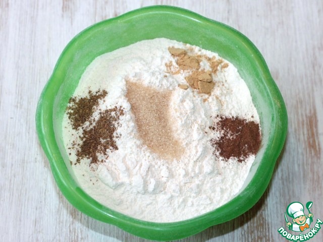 2. Приготовим тесто для блинов. Просейте муку в миску, добавьте в нее корицу, кардамон и имбирь, всыпьте сахар (1 ч. л.) и соль, тщательно перемешайте.