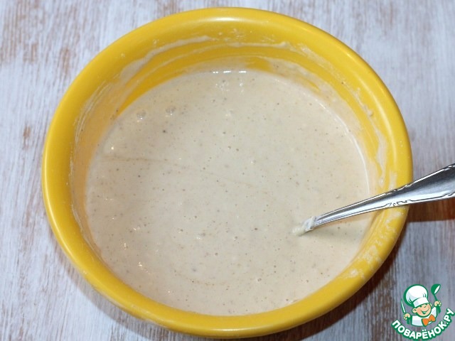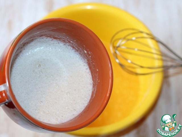 1. Приготовим опару. Смешайте 100 мл теплого молока с дрожжами (1 ч. л.) и 2 ч. л. сахара. Поставьте миску с опарой в теплое место до образования пенной шапочки..