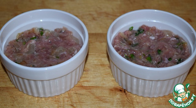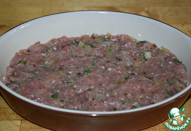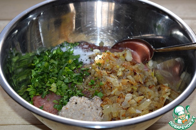 К фаршу (у меня курица/индейка) добавить нарезанный и обжаренный в растительном масле репчатый лук, измельченную зелень, хрен. Посолить, поперчить по вкусу, перемешать.