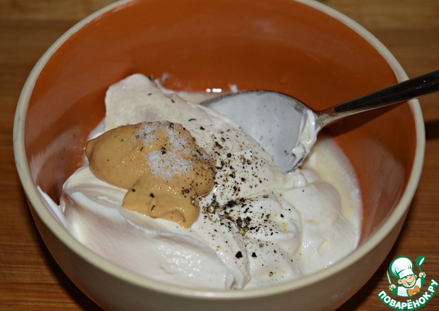 Йогурт смешать с горчицей и лимонным соком. Посолить, поперчить по вкусу.