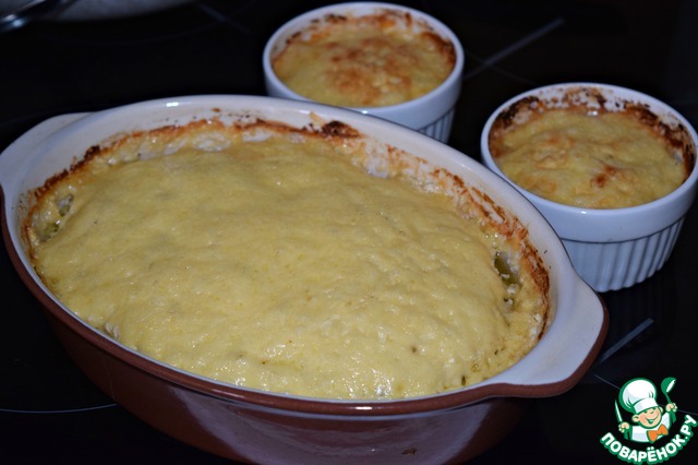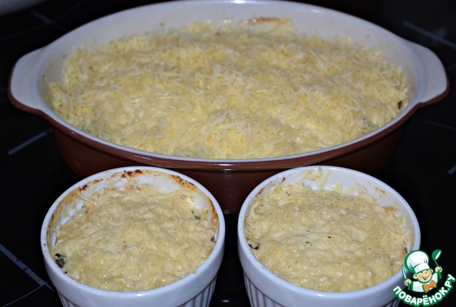 Затем вынуть формы из духовки, посыпать тертым сыром. (подойдет любой сыр, который хорошо плавится) Увеличить температуру в духовке до 200* и запекать ещё минут 5-7, пока сыр не расплавится и слегка не зарумянится.