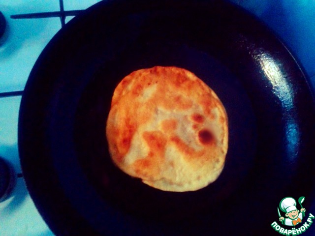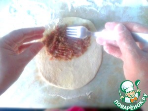 Раскатываем тесто, диаметром приблизительно 13 см, и выкладываем фарш на получившийся пласт.
