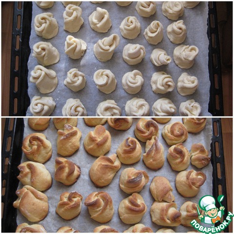 Нежнейшее слоистое печенье из творожного теста двух видов формовки - классических мини-рогаликов и в виде роз - никого не оставит равнодушным и украсит собой любой стол.