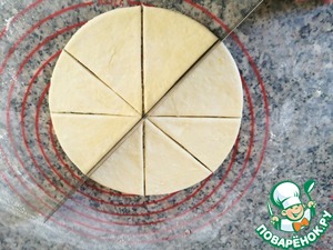 Я вот не сообразила, когда фото делала, что сейчас мы на тесто смотрим под углом сверху, и потому сектора кажутся неровными - поверьте мне на слово, они ровные. Ну, почти. -