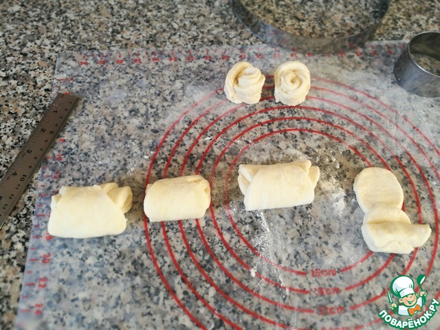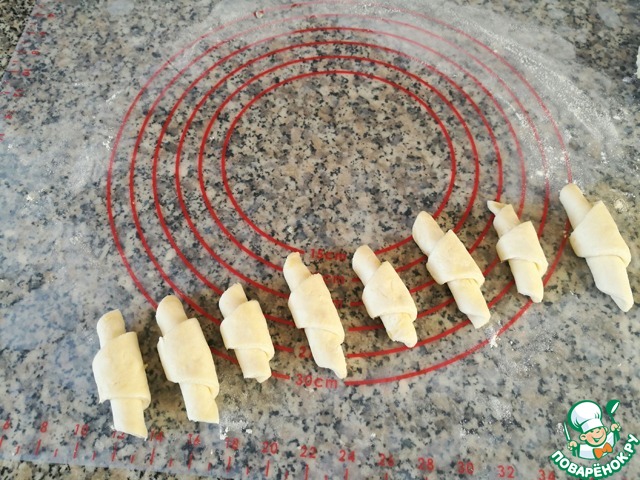 Сейчас, в сыром виде, рогалики немного отличаются друг от друга, потому что закручивать их можно более или менее плотно, но после духовки они значительно увеличатся в объеме и будут практически одинаковы. -