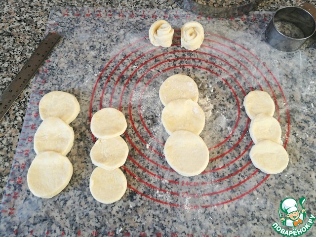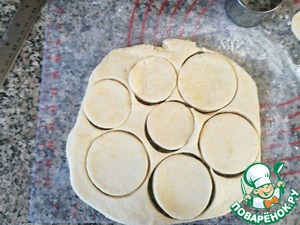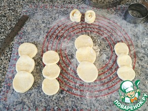 Раскатываем тесто нужной вам толщины и металлическими формочками вырезаем кружки. У меня были формы диаметром 5,5 см и 7, но это совершенно неважно, вы хоть стакан можете взять. -