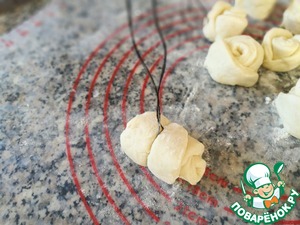 (К слову, когда я делаю булочки Синнабон, я длину скрученного рулета вначале измеряю по линейке, потом считаю, сколько см нужно на каждую булочку, разрезаю ниткой и они получаются все абсолютно одинаковые)