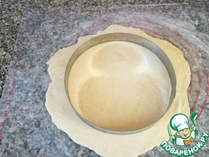 Припылите стол мукой и раскатайте тесто в круг диаметра 22- 23 см толщиной 4 - 6 мм. Творожное тесто будет вкуснее в более тонком слое теста, чем в толстом.