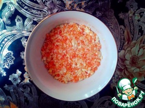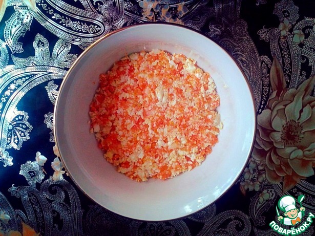 Трем сыр на средней терке, яйца и морковь перетираем толкушкой, чеснок давим через пресс. Смешиваем все ингредиенты. Далее, должна получиться такая масса. -