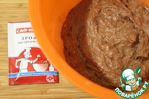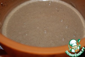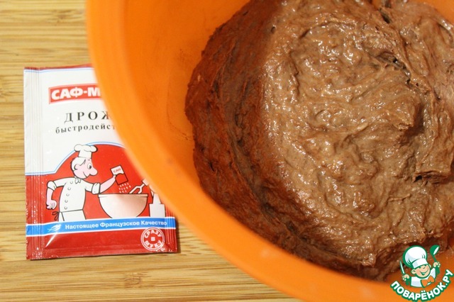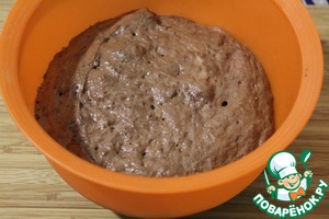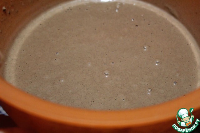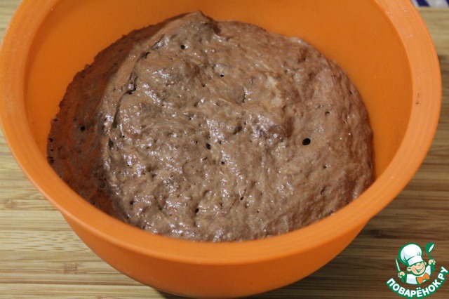Всыпать просеянную муку и какао-порошок, хорошо размешать, накрыть чашу и поставить в теплое место на 1.5 часа.