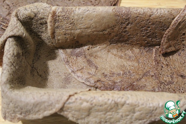 Далее выкладываем блины и начинку- я разрезала блины посередине и выкладывала разрезанной прямой частью к стенке - так ровнее будет слой блинов.
