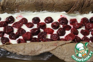 Разделила количество блинов на 3 слоя. И выкладывала - слой блинов - начинка - слой блинов - начинка с вишней -слой блинов -начинка и слой блинов. -