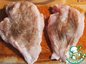 Куриные грудки надрезать на самом толстом месте ножом и развернуть их как книжку. Если грудки большие, на обратной стороне сделать несколько неглубоких поперечных надрезов.