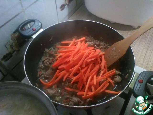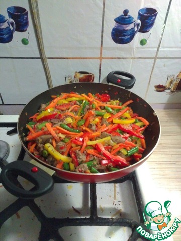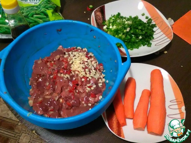 Как печень настоялась в нагретый казан или мультиварку забрасываем печень, обжариваем мин 15 20 добавляем морковь потом перец стручковую фасоль немного молотого перца и ещё чуток соевого соуса туда перемешиваем