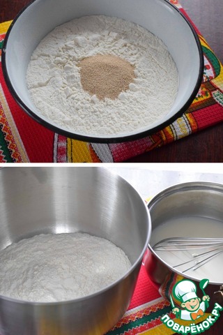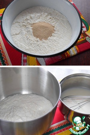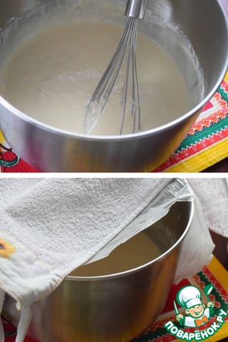 Добавить к муке с дрожжами яично-молочную смесь. Перемешать венчиком. Тесто как сметана средней густоты. Ёмкость с тестом накрыть пленкой и сверху махровым полотенцем. Убрать на 1 час в теплое место (я обычно разогреваю духовку до 170°С, духовка продолжает работать), а сверху, на плиту, кладу деревянную разделочную доску и ставлю тесто.