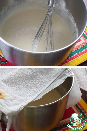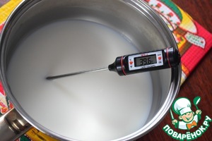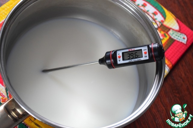Молоко подогреть до 35-40°С (если нет термометра, то пробуйте пальцем - молоко должно быть приятное, тёплое, не в коем случае не должно печь палец).