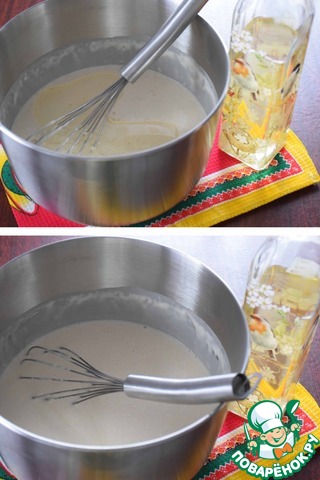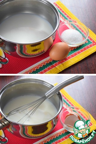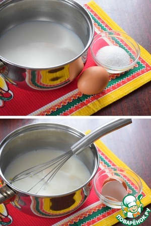 В теплое молоко добавить сахар и яйцо. Венчиком хорошо перемешать (до растворения сахара и получения однородной консистенции).