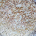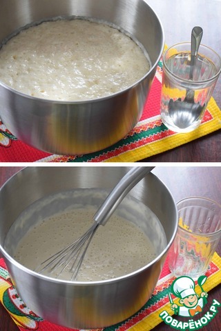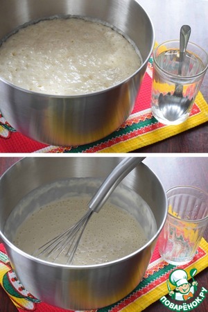 Через 1 час вот такое получаем тесто (оно увеличилось в объеме в 1,5 - 2 раза). Добавляем в подошедшее тесто воду с солью и хорошо перемешиваем венчиком.