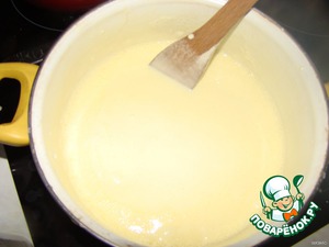 Английский крем: вбейте желтки с оставшимся сахаром (100 гр)в пену.. до побеления.. смешайте эту смесь с молоком... (оно не должно было закипеть).. греем эту смесь.. на медленном огне помешивая.. пока она не загустеет. Определяем готовность с помощью деревянной ложки.. крем должен покрывать ложку не стекать.
