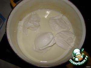 Подогрейте молоко с ванилью.. не дать закипеть и поддерживаем в горячем состоянии на медленном огне... с помощью ложки опускаем в горячее молоко взбитые белки.. и оставляем их там плавать 1-2 - е минуты переварачивая, затем выложим наши островки на салфетку.