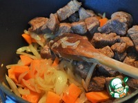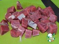 Мякоть говядины нарезать на кубики 3х3 см. Обжарить до румяной корочки на 1 ст. л. растительного масла. |