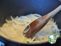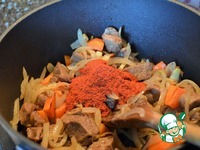 В казане обжарить лук на 1 ст. л. растительного масла до прозрачности, добавив сахар. Добавить резаную морковь и обжарить 4 - 6 минут. |