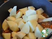 Картофель почистить и нарезать кусками по размеру мяса. Выложить в казан. Тушить на среднем огне. |
