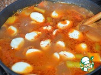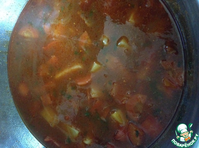 Влить томаты в собственном соку, 1 л кипятка, перемешать и тушить 20 минут. Посолить. Томаты можно заменить свежими помидорами или томатным соусом. |