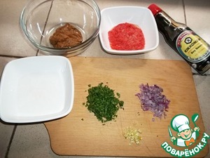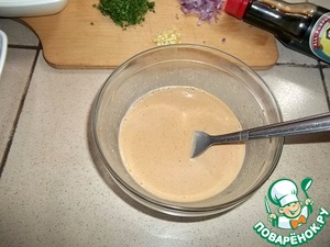 Приготовить маринад для рыбы. Свежую зелень (кориандр, базилик или петрушку по вкусу, у меня заготовка из смеси зелени, пробитой в блендере) мелко порубить. Хорошо смешать соевый соус, зелень, оливковое масло, 1ст. л. лимонного сока (или лайма), пропущенный через пресс чеснок, щепотку смеси перцев.