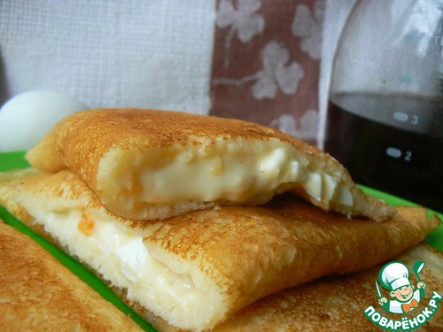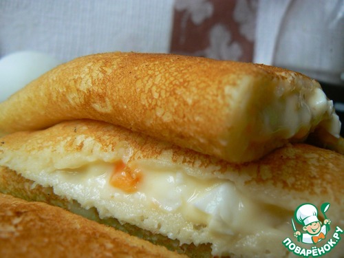 Нежные блинчики и еще более нежная начинка из сырного соуса и яиц, которая по желанию может быть дополнена чесночком. Прошу к столу!