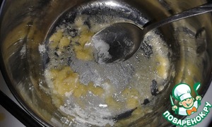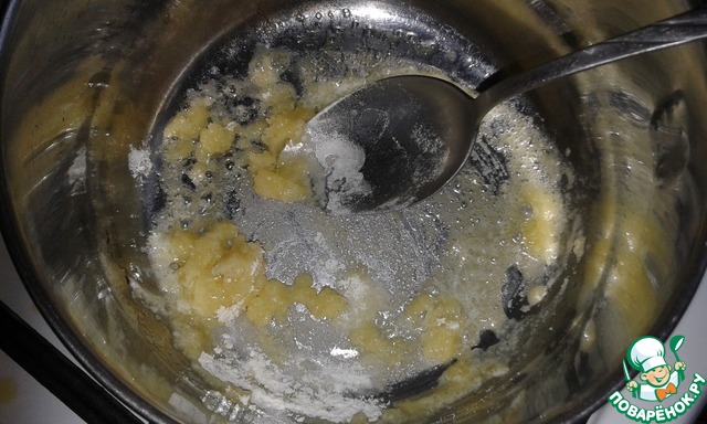 В это время приготовить начинку. В кастрюльке растопить сливочное масло, добавить муку и слегка поджарить